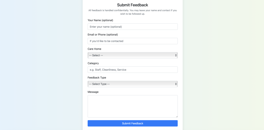 Built by LocalWebsCoder, this multi-location feedback and complaints system allows staff, families, and visitors to submit forms securely — covering suggestions, compliments, concerns and formal complaints. Each care location has its own dashboard while owners get a global view across the entire group.